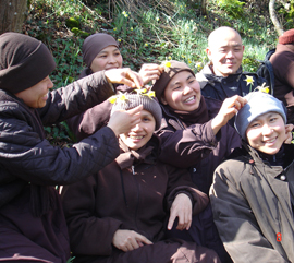 Trong chương trình ngày 26/3 có buổi pháp thoại đặc biệt; sáng sớm, mọi người sau điểm tâm, sẳn sàng tập trung ngay trước sân để chờ kẻng báo, quý thầy và Phật tử đứng quay vòng, một vị bắt nhịp hát bài: Quay về nương tựa, Thở vào thở ra, Đã về, Đã Tới, have arrived: I’m solid, I’ free; Ba Sự Quay Về, Taking refuge in the three jewels, đặc biệt bài Tiếng chuông chùa: Boong boong, tôi là  chuông đại hồng, ngôi chùa xưa trên núi cao…khi hát như thế, các ông tây bà đầm tuổi  “cặp kê” 70 cũng hồn nhiên vui vẽ hai tay ra điệu như lắng nghe chuông, những động tác tương xứng với đoạn nhạc; giữa cảnh núi đồi  mà tập thể già trẻ hoà lẫn niềm vui hoan hỷ như chưa từng vướng bận ưu tư trong đời, quả là Tịnh độ trần gian.