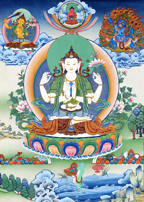 Trong mật tông một người đạt bốn phẩm chất để được sanh vào thế giới thanh tịnh của đức Phật A-Di-Đà (Amitabha Buddha) và những cõi thanh tịnh khác, vào lúc hấp hối, một người sẽ thấy đức Phật và ánh sáng xuất hiện trên nền trời (ánh sáng màu trắng hoặc các áng mây màu sắc khác nhau xuất hiện), các vị trời đang dâng lễ,  và người đó không bao giờ sanh vào các cõi thấp [địa ngục, ngạ quỷ và súc sanh]. Một người sẽ đến thế giới thanh tịnh của đức Phật hoặc tái sanh làm một chúng sinh ở cõi sung sướng. Điều nầy đã được viết trong bài mật tông của ngài Padma Chöpen gyi Gyud:  « Các con, trai cũng như gái, bất kể người nào tụng niệm thần chú Om Mani Padme Hum trong khi nghĩ đến ta, dù chỉ một lần, hoặc chỉ cần ghi nhớ hoặc gìn giữ [thần chú] nơi thân, thanh tịnh hóa năm nghiệp báo liên tục tiêu cực, và tất cả những nghiệp báo xấu và từ bỏ tám thế giới không có cơ hội thực tập chánh Pháp : địa ngục, ngạ quỷ, súc sanh, v…v…  Một người không phải chịu khổ về thân, khẩu, ý.  Một người tự do giải thoát khỏi các sợ hãi về ác thú, kẻ ăn thịt người, người hoặc ma quỷ xấu ác và bệnh tật.  Một người sẽ hiểu được ý nghĩa của Pháp thân (Dharmakaya) ; một người sẽ thấy được sắc thân (rupakaya) và khuôn mặt thiêng liêng của Đấng Từ Bi Vô Lượng. »