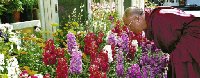 Tibetan spiritual leader, smells the flowers in his garden in Dharamsala. |
