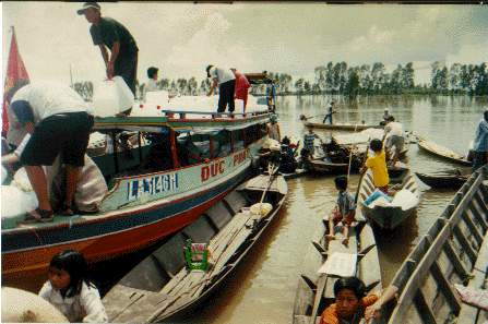 xuồng. Từ đây đoàn chúng tôi phải chuyển hàng hóa cứu trợ xuống ghe