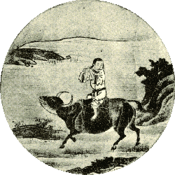 Here the oxherder is playing a flute while riding the ox. The ox still