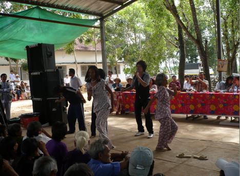 Phần hướng dẫn đạo ca với sự điều khiển của Ni sư Huệ Liên thật đầm ấm, thân thiện cởi mở. Những ánh mắt hân hoan trìu mến hướng về khi ni sư tâm sự “… tôi sẽ đến đây nhiều hơn nữa để được quý vị thương yêu vì tôi rất thương yêu quý vị…”. Các bài hát Phật giáo thấm nhuần tinh thần nhân ái được các trại viên tranh nhau xung phong hát góp vui dù phần quà khuyến khích chỉ một vài quả táo. Không khí lại càng nóng lên với các tiết mục văn nghệ do nghệ sĩ chuyên nghiệp trình bày. Phái đoàn rất đỗi ngạc nhiên khi các cụ già gần 70 tuổi hăng hái bước lên vũ đạo cùng ca sĩ. Say mê trên những bước nhảy trẻ trung, đầy sức sống, chúng tôi chợt nhận ra lửa nhiệt huyết trong mỗi con người nơi đây thì ra vẫn còn âm ỉ chưa hề lịm tắt sau những trái ngang khổ đau bất hạnh của cuộc đời. Họ là những người nghèo, những bệnh nhân tật nguyền, già yếu, neo đơn, thất học, thất nghiệp, bơ vơ giữa đời. Nghịch cảnh đã khiến từng cụ ông, cụ bà phải rời nhà vào đây sống với những ngày lặng lẽ. Nếu không có những buổi sinh hoạt vui chơi tập thể thế này, ắt hẳn họ sẽ chẳng bao giờ có dịp nở nụ cười tươi lại càng không được trở về tuổi thơ hồn nhiên trong sáng.