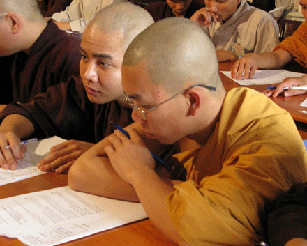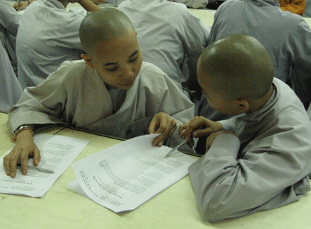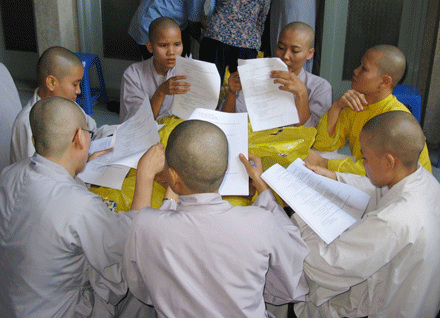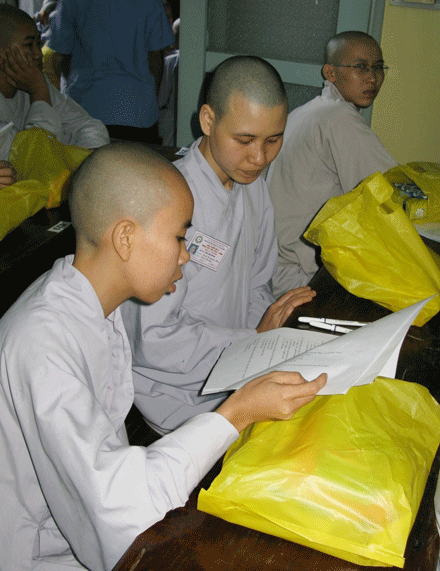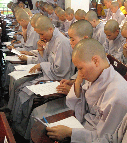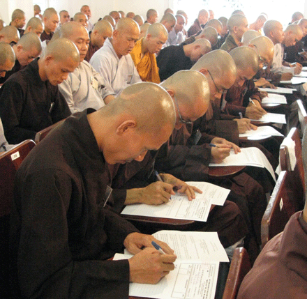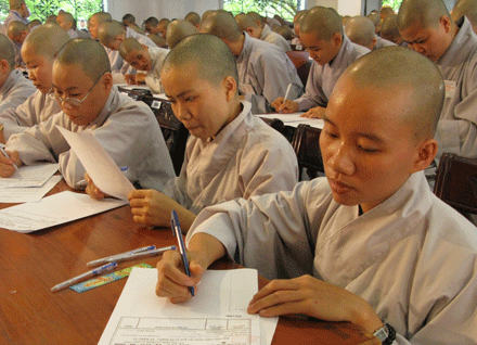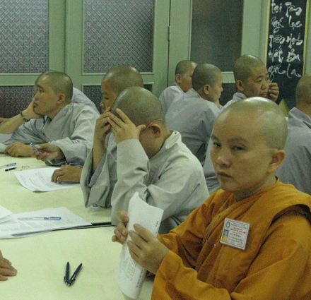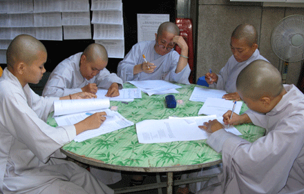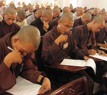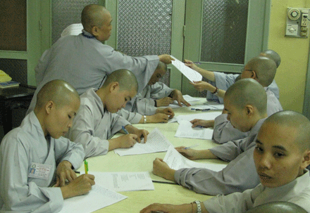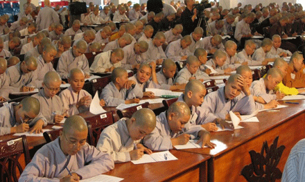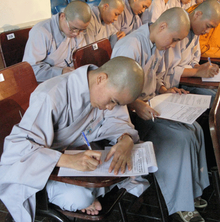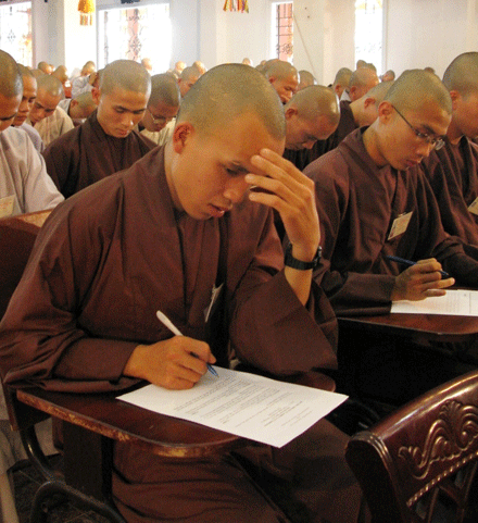 Vò đầu suy nghĩ, mắt nhìn xa xăm, chống cằm trầm ngâm hay hí hoáy viết là cảnh thường thấy ở bất kỳ cuộc thi nào. Cuộc thi tuyển  tại Đại giới đàn Huệ Lưu PL: 2552 – DL: 2008 dù không quá khắt nghiệt nhưng cũng không ngoại lệ. Phóng sự ảnh sau đây sẽ cho bạn đọc hình dung phần nào tâm trang của những “sĩ tử” đặc biệt tại giới trường.