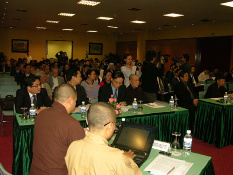 Chủ tọa buổi họp báo có chư Hòa thượng Phó chủ tịch HĐTS: HT. Thích Thanh Tứ, HT. Thích Hiển Pháp, HT. Thích Trí Quảng, ông Nguyễn Thế Doanh- Trưởng ban tôn giáo Chính phủ - Trưởng ban điều phối Quốc gia Đại lễ VESAK 2008 của Luên hợp quốc, Giáo sư Lê Mạnh Thát - Chủ tịch Uỷ ban tổ chức Quốc tế IOC -Tổng thư ký ban điều phối Quốc gia, ông Hoàng Hữu Lượng - Cục trưởng Cục Báo chí - Bộ thông tin và truyền thông - uỷ viên ban điều phối Quốc gia.