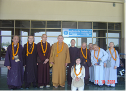 18-10-2008: Đến Gaya lúc 8g50´ sáng. Hai thầy Hạnh Tuệ và Hạnh Bổn đem theo vòng hoa ra đón. Tới Ấn Độ là thấy „trần ai“ rồi, mà Gaya lại càng trần ai hơn. Vì Gaya, thuộc Bihar là tiểu bang nghèo nhất nước Ấn. Mấy ông kiểm soát giấy làm chậm như rùa. Thỉnh thoảng ngẩng đầu lên liếc liếc dòm dòm muốn kiếm cớ, trông thấy ghét! Có điêù ở đây và Thái Lan, tu sĩ được ưu tiên. Ngồi đợi, đi tàu, hoặc xe buýt .v.v… đều được ưu đãi. Không như ở Nhật và Taiwan, cứ tỉnh bơ, theo nguyên tắc „tự do bình đẳng“. Thật là xứ Phật-giáo có khác! Phi trường Gaya cách Bồ Đề Đạo Tràng 14 km, mới mở năm 2002, rất tiện lợi cho việc hành hương. Bốn hãng bay Sri-Lanka, Indian Airline, Thái và Druk Air thường xuyên có chuyến bay. Lúc trước phải qua ngả New Dehli, hoặc Kalkutta, rồi từ đó đi suốt đêm bằng tàu lửa hoặc xe buýt về Gaya, rất cực nhọc…. Phái đoàn đứng chụp hình với 9 vòng hoa đeo cổ, trông thật oai vệ giống như những vị quốc khách! Từ phi trường về Trung tâm Viên Giác chưa tới 30´. Đường xá tốt hơn mọi khi. Dầu vậy, nhiều lúc phải thét lên đứng tim, vì bác tài chạy lạn „quá đẹp“, không thua gì ở Việt-Nam! Tới nơi, có mấy anh Ấn Độ phụ đưa vali lên phòng. Sau khi lễ Phật và nhận „chỉ thị“, mọi người về phòng nghỉ. Hai người một phòng, có tivi, toillette phòng tắm riêng. Khí hậu dễ chịu, chỉ buổi trưa hơi nóng (gần cuối tháng 10 mà). Trung tâm Viên-Giác mùa nầy bận rộn tiếp đón phái đoàn các nơi đến, vì là mùa hành hương. Kỳ nầy có phái đoàn Thầy Đồng Văn ở Đức sắp qua (Thầy đi Nhật rồi về lại Đức 1 tuần để dẫn phái đoàn Đức hành hương Ấn Độ), phái đoàn ở Mỹ, ở Việt-Nam ….