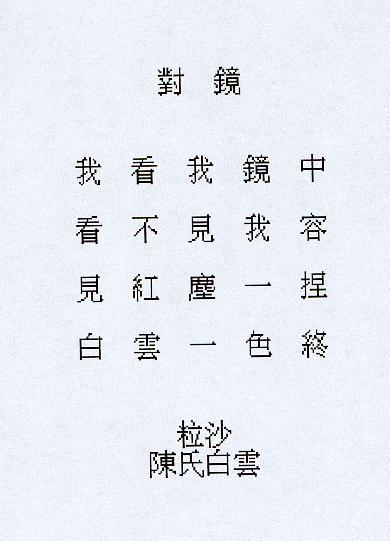 Ðối kính Hạt Cát Ðối kính Ngã khán ngã kính trung Khán bất kiến ngã dung Kiến hồng trần nhất niết Bạch vân nhất sắc chung ! Ta nhìn ta trong kính Ta chẳng thấy ta đâu Thấy bụi hồng một nắm Và mây trắng một màu !